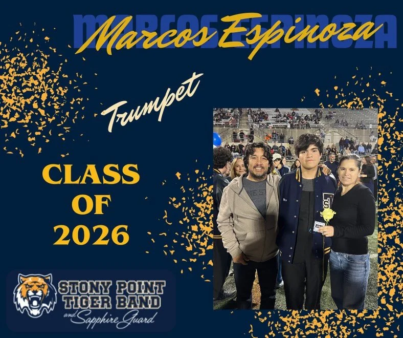 View fullsize Help us celebrate our 2026 Stony Point Tiger Band and Sapphire Guard senior Diego Baez!